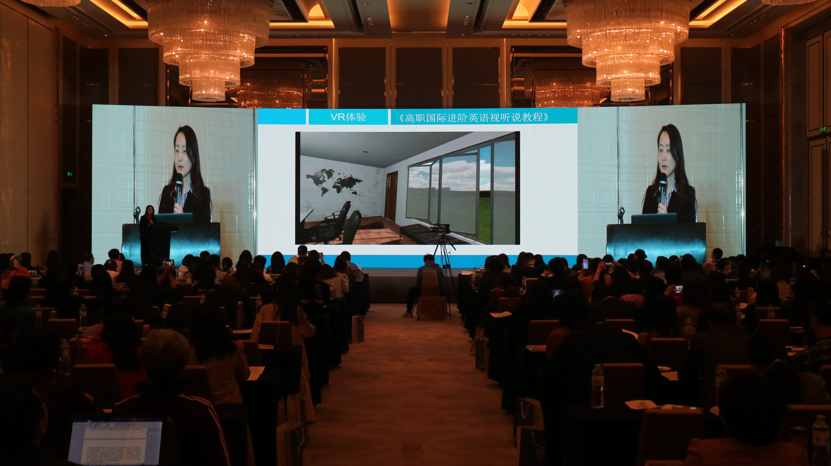 19日晚,由pg电子试玩 李颖、刘倩、陈敏和辛静等教师参与编写的“高职国际进阶英语”系列教材举行了新书发布会。该套教材与英国柯林斯出版集团合作出版,为“十二五”职业教育国家规划教材。 20日,李颖以“融合多种媒体手段,创新英语教学模式——探索VR、慕课、微课等在英语教学中的运用”为题作了大会主旨发言。首次发布了与《高职国际进阶英语视听说教程》配套的“职场英语VR实训场景”示例,给与会代表留下深刻的印象。