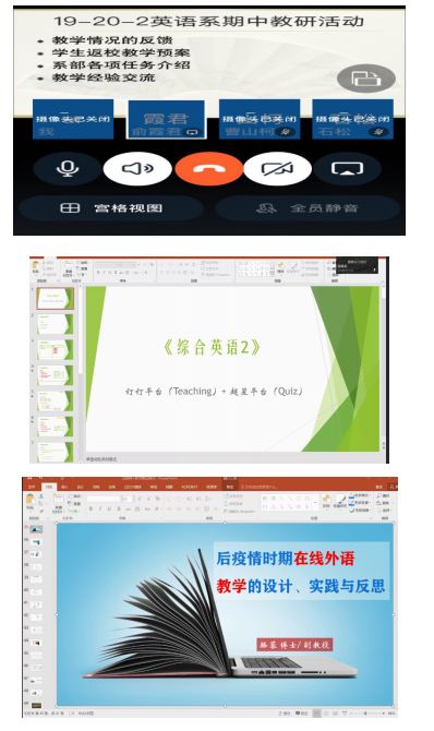 由于今年情况特殊,学生在正式返校之前的所有课程均在线上授课。根据学生反馈的意见,pg电子试玩 英语系教师都能灵活、熟练地运用线上教学方式(如钉钉、腾讯会议、超星、学习通等),与学生进行有效的交流和互动。目前,英语系的整体教学情况正常,教学任务进展顺利。