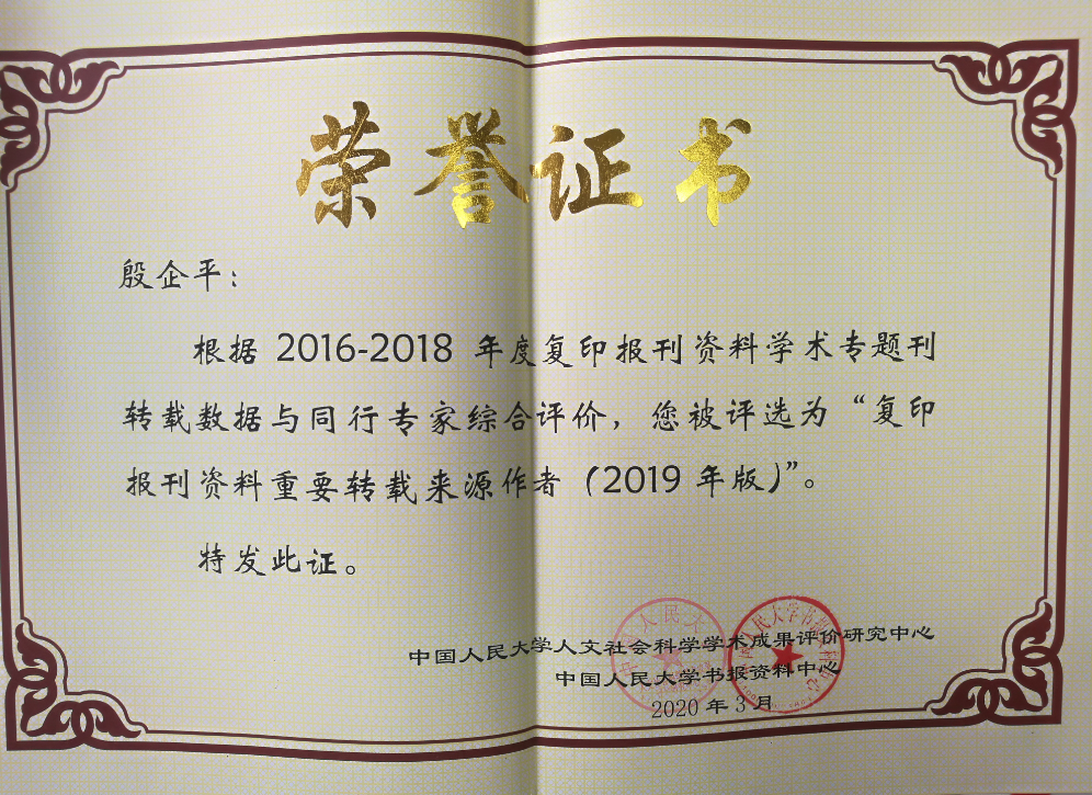 近日,中国人民大学人文社科学术成果评价研究中心与中国人民大学书报资料中心联合发布《复印报刊资料重要转载来源作者(2019版)》名录。根据2016-2018年人大复印转载数据和同行专家评议结果,中心共评选出883名人文社科学者。其中,全国外国语言文学界仅有3人入选,我校pg电子试玩 殷企平教授名列其中。