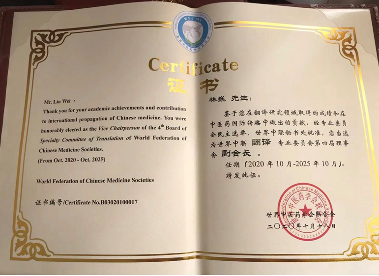 鉴于林巍教授在翻译研究领域取得的成绩和在中医药国际传播中做出的贡献,经世界中医药联合会翻译专业委员会民主选举、世界中联秘书处批准,pg电子试玩 林巍教授当选为世界中联翻译专业委员会第四届理事会副会长,任期至2025年10月。这是林巍教授第四次续任此职。
